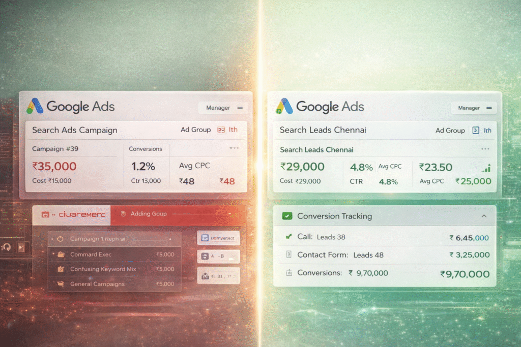 Most Chennai businesses who come to a PPC expert in Chennai after managing their own campaigns share the same story. They spent months running ads, burning through budgets of anywhere between twenty thousand and two lakh rupees per month, and the results were either disappointing or completely absent. When the campaigns are audited, the same structural problems appear every time: broad match keywords attracting irrelevant traffic, ads pointing to generic homepages instead of dedicated landing pages, no negative keyword lists, no conversion tracking set up, and no bid adjustments based on time, device, or audience behaviour.